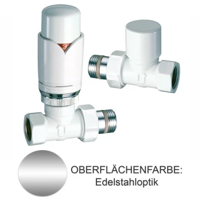 Design-Armaturen Set VD-10 bestehend aus einem Fühlerelement und einem Ventilgehäuse für Ventilmontage im Vorlauf.