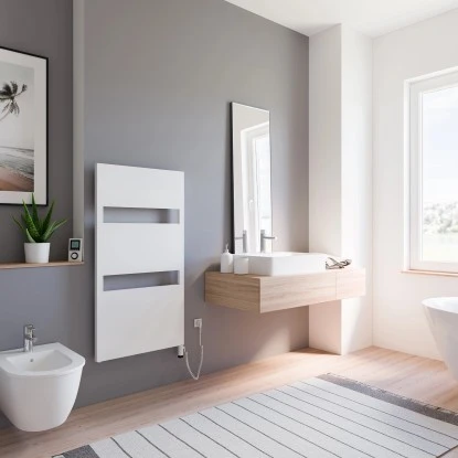 Der steckerfertige Schulte Badheizkörper Turin mit Heizstab kennzeichnet sich durch seine beinahe vollflächige Front, die nur durch einige Ausschnitte unterbrochen wird. In diesen können Sie wunderbar Ihre Handtücher aufhängen – egal, ob zum Trocknen nach oder zum Aufwärmen vor dem Gebrauch. Diese ausgefeilte Optik geht mit einer starken, zuverlässigen Wärmeleistung einher, welche Ihre Räumlichkeiten langfristig und zufriedenstellend heizen wird.